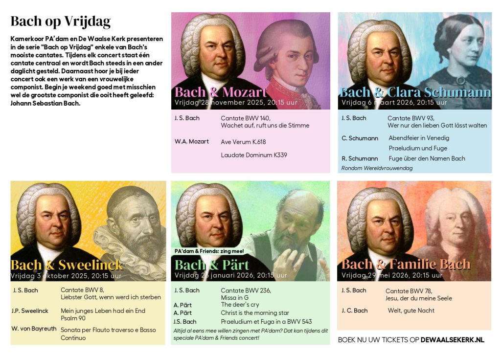 Bach staat centraal, meestal in een van zijn cantates, naast een andere grootheid uit de muziekwereld. En: altijd muziek van vrouwelijke componisten!